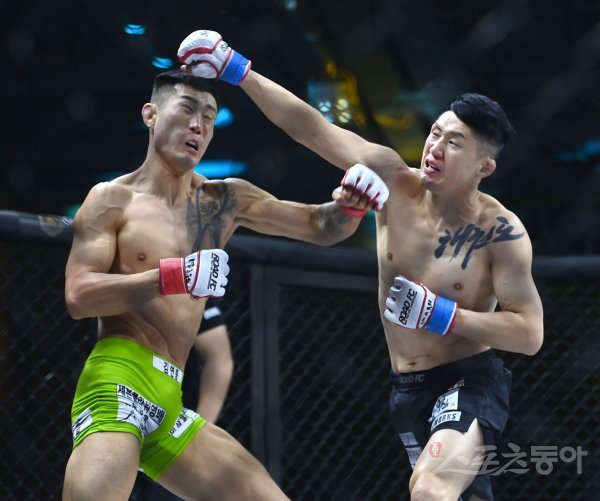 18일 서울 서대문구 스위스 그랜드 호텔 서울에서 ‘굽네 ROAD FC 062’ 가 열렸다. 밴텀급 타이틀전에서 장익환(완쪽)과 문제훈이 경기를 펼치고 있다.