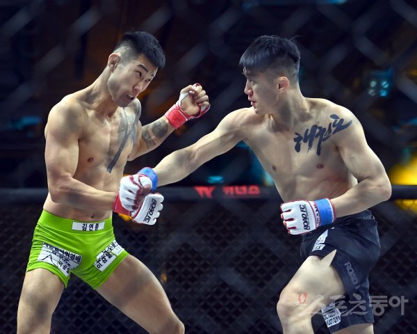 18일 서울 서대문구 스위스 그랜드 호텔 서울에서 ‘굽네 ROAD FC 062’ 가 열렸다. 밴텀급 타이틀전에서 장익환(왼쪽)과 문제훈이 경기를 펼치고 있다.