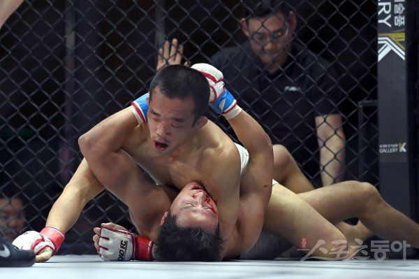 18일 서울 서대문구 스위스 그랜드 호텔 서울에서 ‘굽네 ROAD FC 062’ 가 열렸다. 페더급 타이틀전에서 박해진(위)과 박승모가 경기를 펼치고 있다.