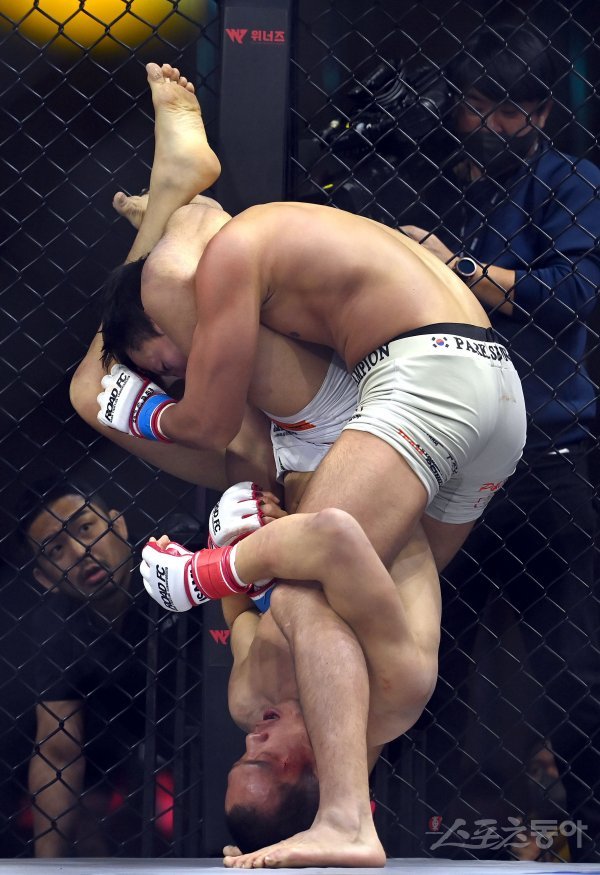 18일 서울 서대문구 스위스 그랜드 호텔 서울에서 ‘굽네 ROAD FC 062’ 가 열렸다. 페더급 타이틀전에서 박해진(아래)과 박승모가 경기를 펼치고 있다.