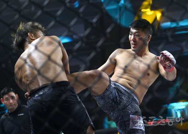 18일 서울 서대문구 스위스 그랜드 호텔 서울에서 ‘굽네 ROAD FC 062’ 가 열렸다. 73kg 계약체중 매치에서 권아솔(한국)과 나카무라 코지(일본)가 경기를 펼치고 있다.