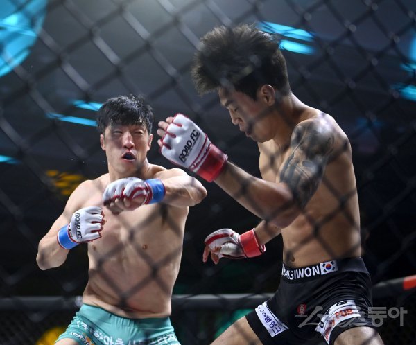 18일 서울 서대문구 스위스 그랜드 호텔 서울에서 ‘굽네 ROAD FC 062’ 가 열렸다. 라이트급 타이틀전에서 박시원과 여제우(왼쪽)가 경기를 펼치고 있다.