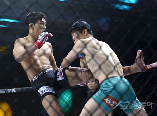 18일 서울 서대문구 스위스 그랜드 호텔 서울에서 ‘굽네 ROAD FC 062’ 가 열렸다. 라이트급 타이틀전에서 박시원(왼쪽)과 여제우가 경기를 펼치고 있다.