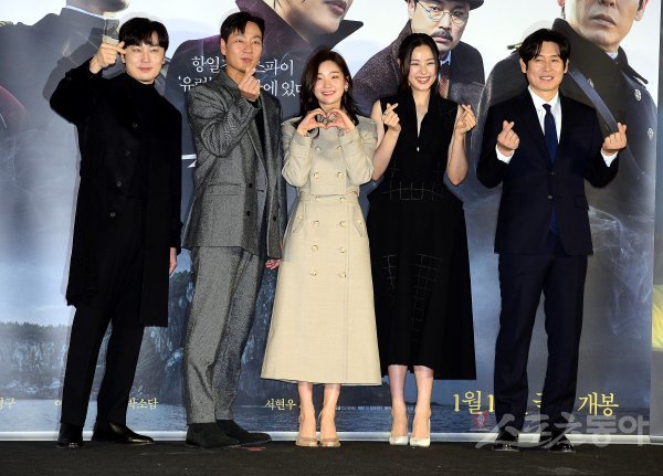 배우 서현우, 박해수, 박소담, 이하늬, 설경구가 19일 서울 용산구 CGV용산아이파크몰에서 열린 영화 ‘유령’ 제작보고회에서 카메라를 향해 포즈를 취하고 있다.