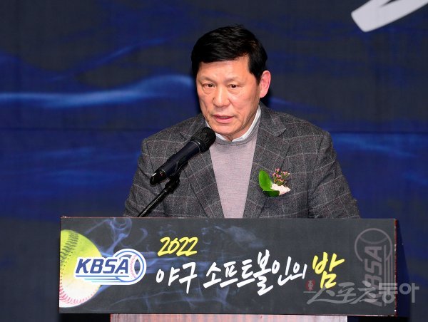 19일 서울 마포구 서울가든호텔에서 열린 ‘2022 야구·소프트볼인의 밤’ 행사에 참석한 허구연 KBO 총재가 축사를 밝히고 있다.