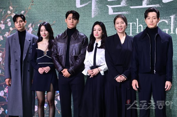 배우 박성훈, 임지연, 이도현, 송혜교, 염혜란, 정성일이 20일 서울 종로구 JW메리어트동대문스퀘어서울에서 열린 넷플릭스 시리즈 ‘더 글로리’ 제작발표회에서 포즈를 취하고 있다.