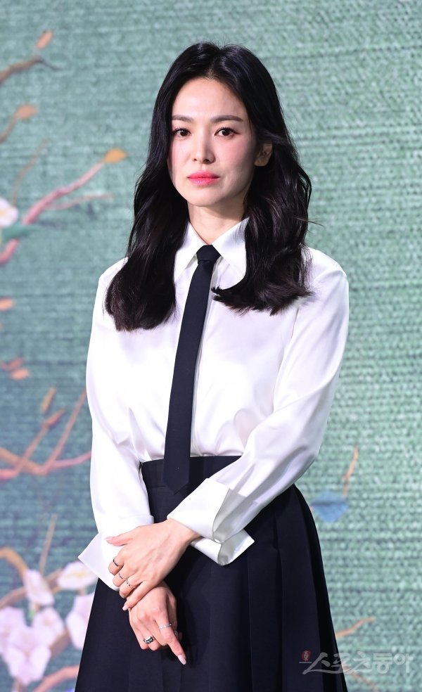 배우 송혜교가 20일 서울 종로구 JW메리어트동대문스퀘어서울에서 열린 넷플릭스 시리즈 ‘더 글로리’ 제작발표회에서 포즈를 취하고 있다.