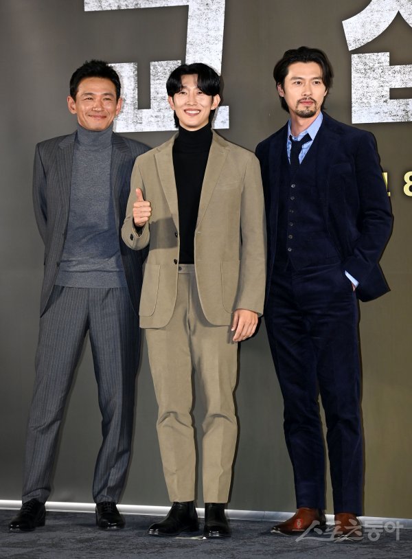 배우 황정민, 강기영, 현빈이 20일 서울 성동구 메가박스 성수에서 열린 영화 ‘교섭’ 제작보고회에서 포토타임을 갖고 있다.