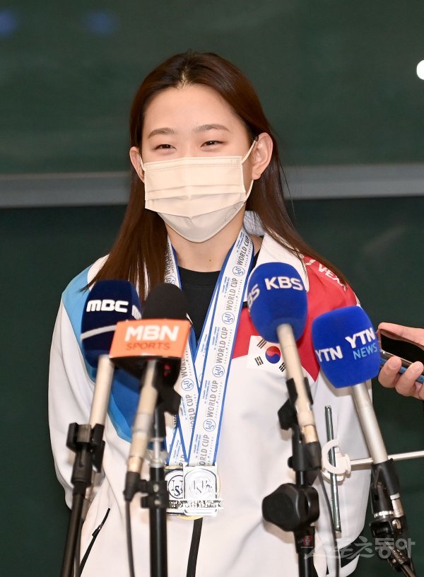 2022-23 국제빙상경기연맹(ISU) 스피드스케이팅 월드컵 4차 대회 여자 500m에서 우승을 차지한 김민선이 20일 인천국제공항을 통해 입국해 인터뷰를 하고 있다.
