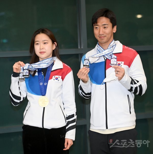 2022-23 국제빙상경기연맹(ISU) 스피드스케이팅 월드컵 4차 대회 여자 500m에서 우승을 차지한 김민선과 남자 500m에서 우승한 김준호가 20일 인천국제공항을 통해 입국하고 있다.
