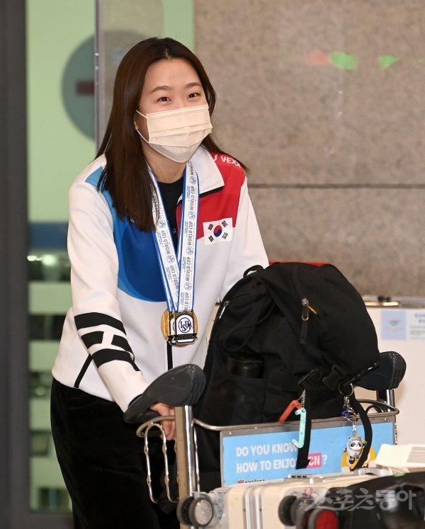 2022-23 국제빙상경기연맹(ISU) 스피드스케이팅 월드컵 4차 대회 여자 500m에서 우승을 차지한 김민선이 20일 인천국제공항을 통해 입국하고 있다.