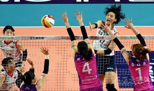 20일 인천 삼선월드체육관에서 ‘2022-2023 도드람 V리그’ 인천 흥국생명과 서울 GS칼텍스의 여자부 경기가 열렸다. GS칼텍스 문지윤이 흥국생명 블로커를 피해 공격을 펼치고 있다.