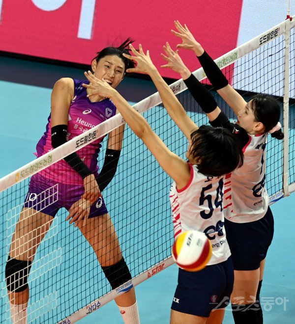 20일 인천 삼선월드체육관에서 ‘2022-2023 도드람 V리그’ 인천 흥국생명과 서울 GS칼텍스의 여자부 경기가 열렸다. 흥국생명 김연경이 GS칼텍스 블로커를 피해 스파이크를 날리고 있다.
