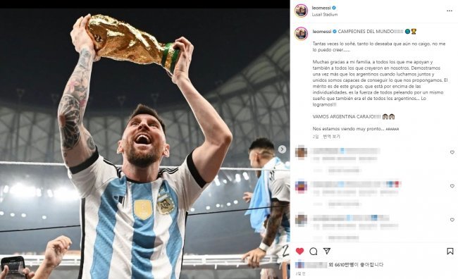 해당 게시물은 메시가 월드컵을 들고 환호하는 모습, 월드컵에 입을 맞추고 있는 모습, 아르헨티나 선수단이 환호하는 모습 등이 담겼다.