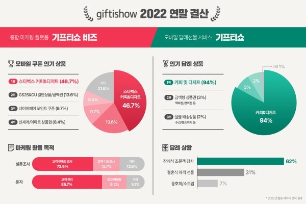 네이버페이 포인트 쿠폰은 비대면 및 온라인 쇼핑의 성장세 속 활용 가치가 높아 전년 대비 발송 비중이 2배 이상 상승하며 기업 고객의 많은 사랑을 받았다. 스타벅스 커피 쿠폰은 합리적인 가격으로 선물이 가능하고 매장 수가 많아 교환이 용이한 점이 작용해 부동의 1위를 차지했다.