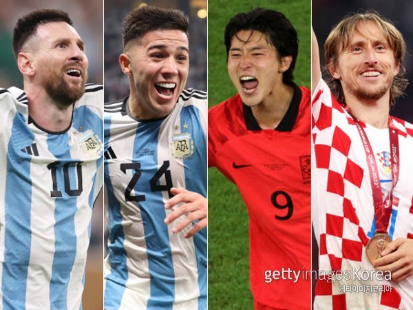 카타르월드컵은 노장의 라스트 댄스와 신성의 쇼케이스가 돋보인 대회였다. 5번째 월드컵에서 우승컵을 들어올린 리오넬 메시, 이번 대회 가장 빛난 신성 엔소 페르난데스, 한국의 12년만의 16강행을 이끈 조규성, 3위로 마지막 월드컵을 마친 루카 모드리치(왼쪽부터). 사진=게티이미지코리아