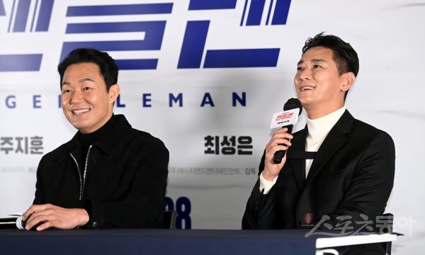 21일 서울 강남구 메가박스 코엑스에서 열린 영화 ‘젠틀맨’ 시사회에서 배우 박성우과 주지훈이 쥐재진의 질문에 대답하고 있다.