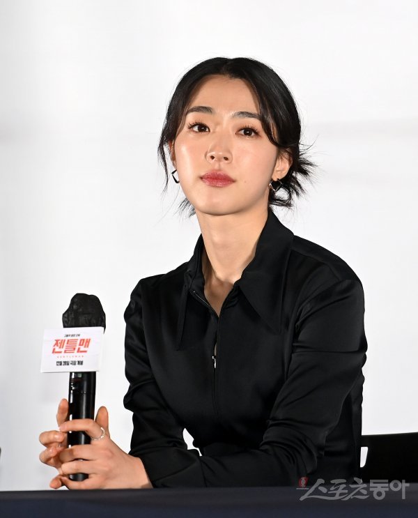 21일 서울 강남구 메가박스 코엑스에서 열린 영화 ‘젠틀맨’ 시사회에서 배우 최성은이 쥐재진의 질문에 대답하고 있다.