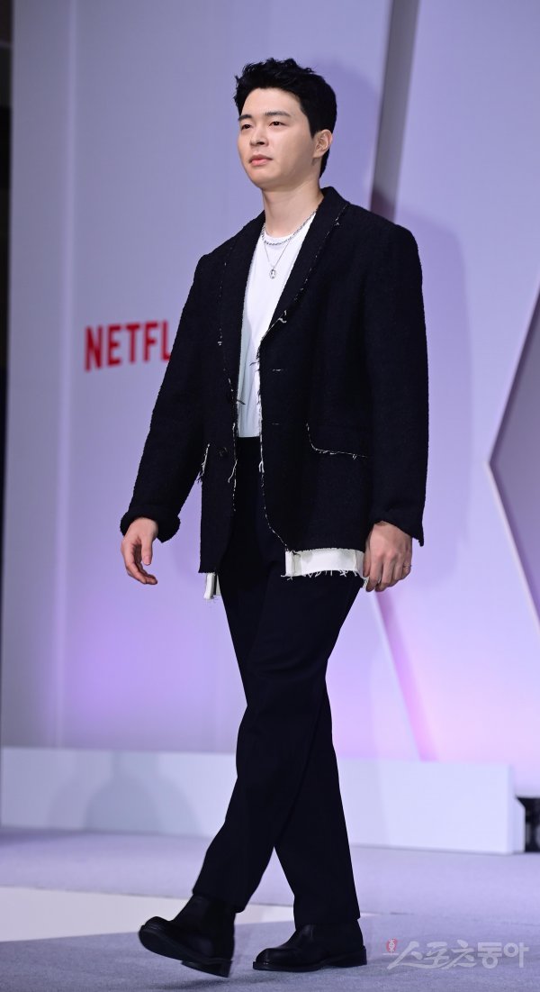 배우 이상운이 21일 서울 강남구 역삼동 조선팰리스 서울강남에서 열린 넷플릭스 시리즈 ‘더 패뷸러스’ 제작발표회 무대에 오르고 있다.
