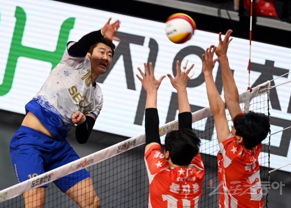 21일 경기도 안산 상록수체육관에서 ‘2022-2023 도드람 V리그’ 안산 OK금융그룹과 서울 우리카드의 남자부 경기가 열렸다. 우리카드 나경복이 OK금융그룹 블로커를 피해 스파이크를 날리고 있다.