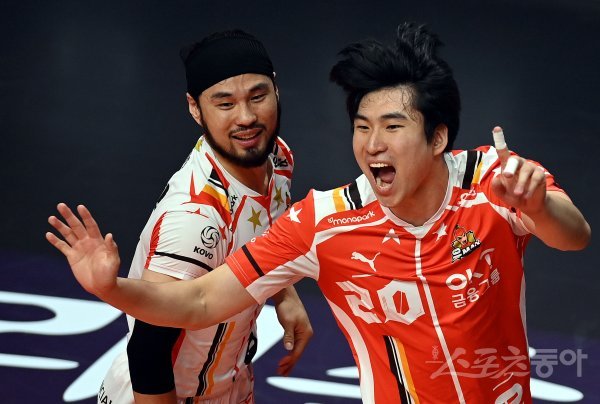 21일 경기도 안산 상록수체육관에서 ‘2022-2023 도드람 V리그’ 안산 OK금융그룹과 서울 우리카드의 남자부 경기가 열렸다. OK금융그룹 신호진이 득점을 올린 후 환호하고 있다.