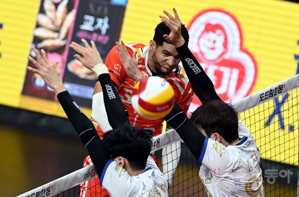 21일 경기도 안산 상록수체육관에서 ‘2022-2023 도드람 V리그’ 안산 OK금융그룹과 서울 우리카드의 남자부 경기가 열렸다. OK금융그룹 레오가 우리카드 블로커를 피해 스파이크를 날리고 있다.