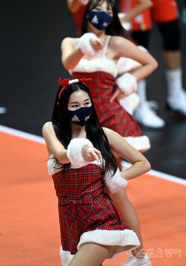 21일 경기도 안산 상록수체육관에서 ‘2022-2023 도드람 V리그’ 안산 OK금융그룹과 서울 우리카드의 남자부 경기가 열렸다. OK금융그룹 치어리더가 화려한 공연을 펼치고 있다.