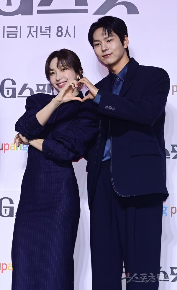 배우 안희연(하니), 박선호가 22일 서울 강남구 역삼동 조선팰리스 서울강남에서 열린 쿠팡플레이 시리즈 ‘판타G스팟’ 제작발표회에서 포즈를 취하고 있다.
