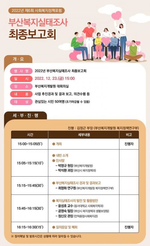부산시가 오는 23일 부산복지개발원에서 ‘2022년 부산시 복지실태조사 최종 보고회’를 개최한다고 밝혔다.- 오는 23일 복지실태조사 추진 경과·활용 방안 논의