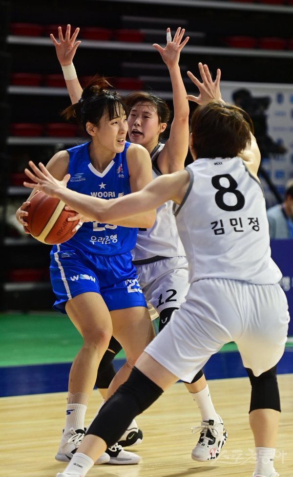 22일 아산이순신체육관에서 열린‘신한은행 SOL 2022~2023 여자프로농구‘ 우리은행과 청주 KB의 경기에서 우리은행 김단비가 KB 수비 사이에서 동료를 찾고 있다.