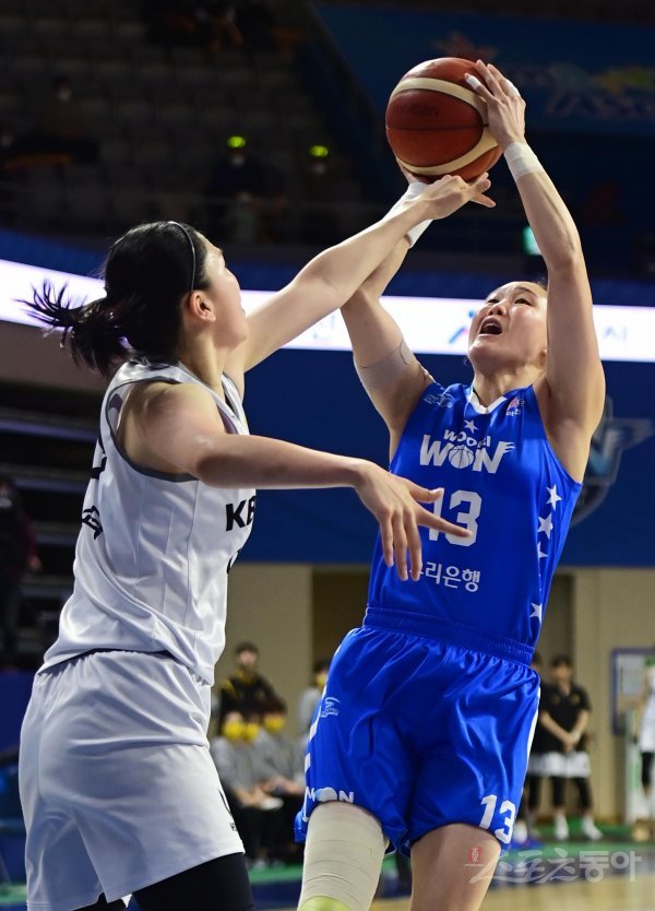 22일 아산이순신체육관에서 열린‘신한은행 SOL 2022~2023 여자프로농구‘ 우리은행과 청주 KB의 경기에서 우리은행 김정은이 KB 수비 앞에서 슛을 하고 있다.