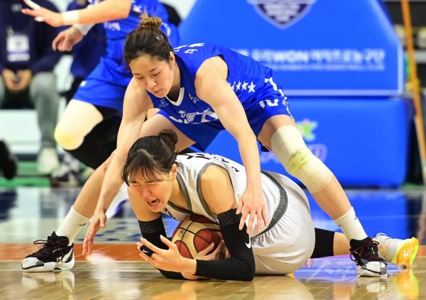 22일 아산이순신체육관에서 열린‘신한은행 SOL 2022~2023 여자프로농구‘ 우리은행과 청주 KB의 경기에서 KB 박지수가 우리은행 고아라의 수비에 넘어지고 있다.