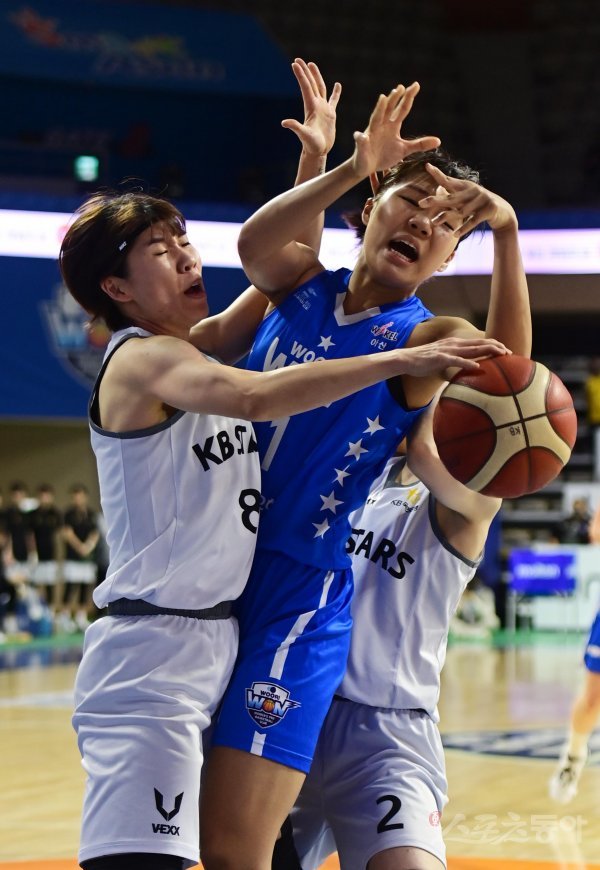 22일 아산이순신체육관에서 열린‘신한은행 SOL 2022~2023 여자프로농구‘ 우리은행과 청주 KB의 경기에서 KB 김민정이 우리은행 박지현의 볼을 빼았는 과정에서 반칙을 범하고 있다.
