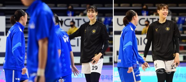 22일 아산이순신체육관에서 열린‘신한은행 SOL 2022~2023 여자프로농구‘ 우리은행과 청주 KB의 경기에 앞서 KB 박지수가 우리은행 선수와 인사 후 고개를 돌리고 있다.