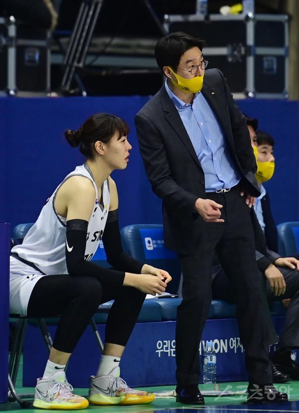 22일 아산이순신체육관에서 열린‘신한은행 SOL 2022~2023 여자프로농구‘ 우리은행과 청주 KB의 경기에서 KB 박지수가 교체 출전을 기다리며 김완수 감독과 이야기를 하고 있다.