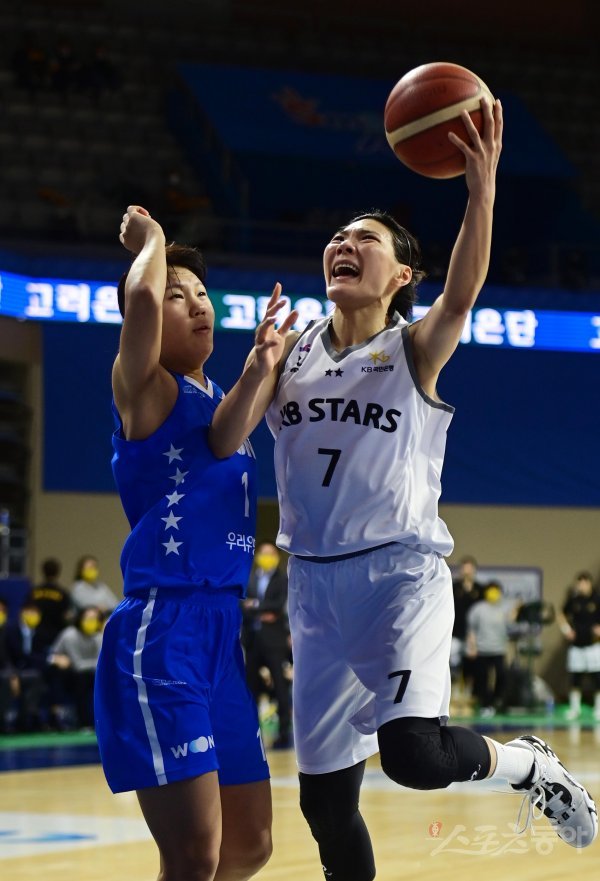 22일 아산이순신체육관에서 열린‘신한은행 SOL 2022~2023 여자프로농구‘ 우리은행과 청주 KB의 경기에서 KB 최희진이 우리은행 박지현의 앞에서 슛을 하고 있다.