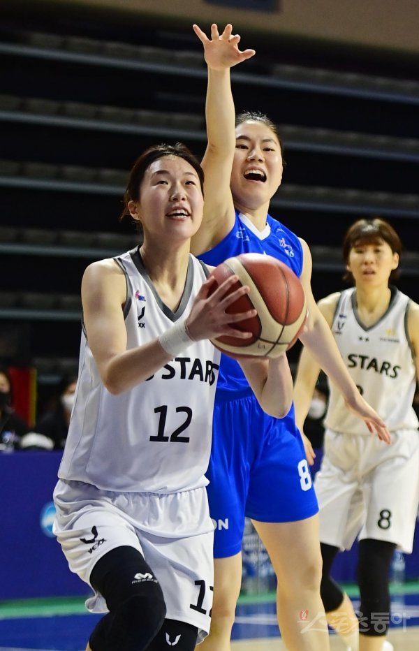 22일 아산이순신체육관에서 열린‘신한은행 SOL 2022~2023 여자프로농구‘ 우리은행과 청주 KB의 경기에서 KB 양지수가 우리은행 수비를 뚫고 슛을 하고 있다.