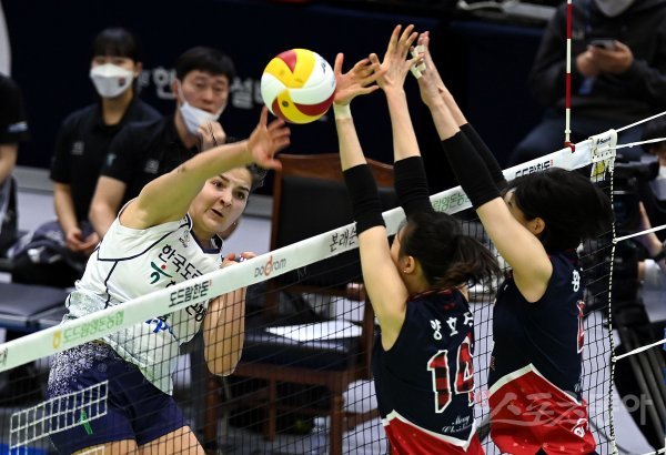 22일 경기도 수원체육관에서 ‘2022-2023 도드람 V리그’ 수원 현대건설과 김천 한국도로공사의 여자부 경기가 열렸다. 한국도로공사 카타리나가 현대건설 블로커를 피해 스파이크를 날리고 있다.