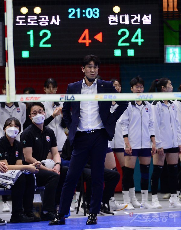 22일 경기도 수원체육관에서 ‘2022-2023 도드람 V리그’ 수원 현대건설과 김천 한국도로공사의 여자부 경기가 열렸다. 한국도로공사 김종민 감독이 경기를 지켜보고 있다.