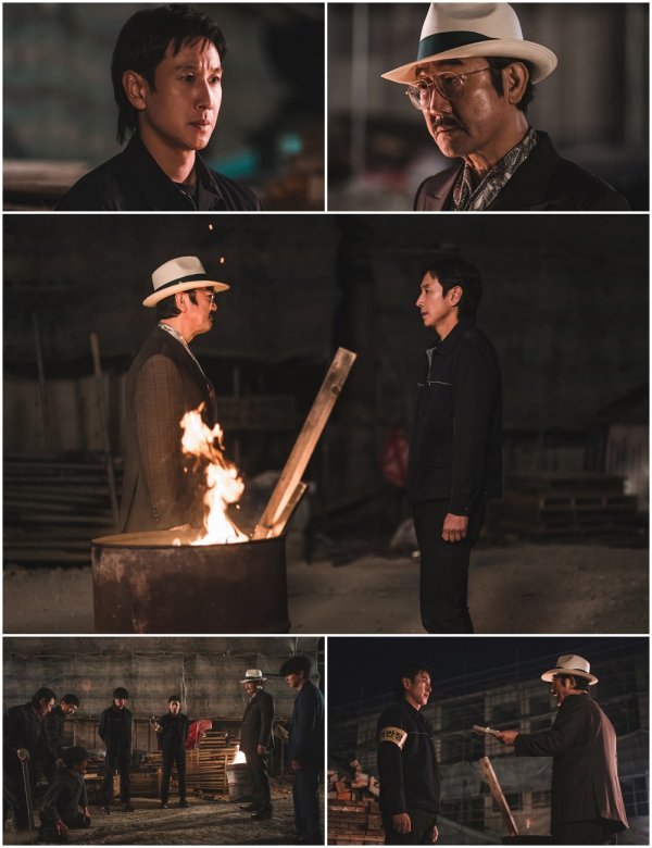 이와 관련해 이선균과 김홍파가 강렬한 카리스마로 프레임을 장악한 첫 만남이 포착됐다. 극중 은용과 명회장, 한 무리의 사내들이 건물 공사가 진행 중인 건설 현장에 모여 있는 장면.