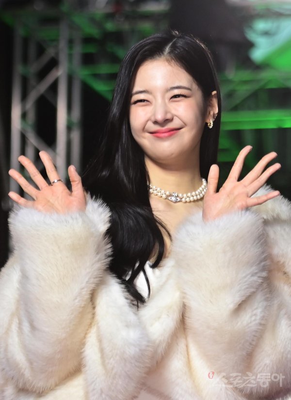 있지 리아가 24일 서울 고척스카이돔에서 열린 ‘2022 SBS 가요대전’ 레드카펫에서 취재진에게 인사하고 있다.
