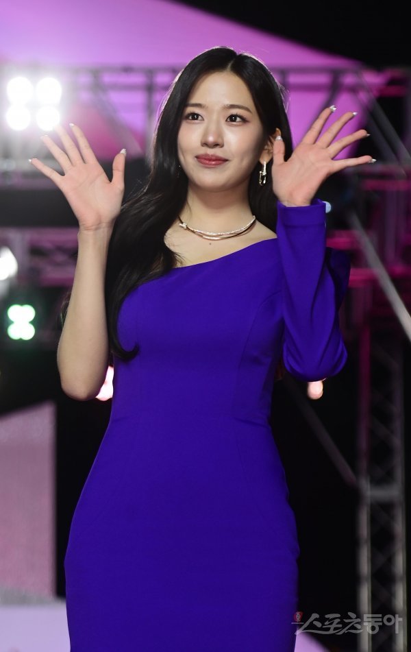 아이브 안유진이 24일 서울 고척스카이돔에서 열린 ‘2022 SBS 가요대전’ 레드카펫에서 취재진에게 인사하고 있다.