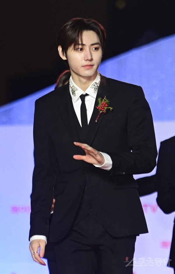 엔하이픈 성훈이 24일 서울 고척스카이돔에서 열린 ‘2022 SBS 가요대전’ 레드카펫에서 취재진에게 인사하고 있다.