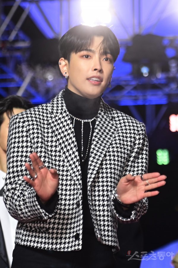 에이티즈 홍중이 24일 서울 고척스카이돔에서 열린 ‘2022 SBS 가요대전’ 레드카펫에서 취재진에게 인사하고 있다.