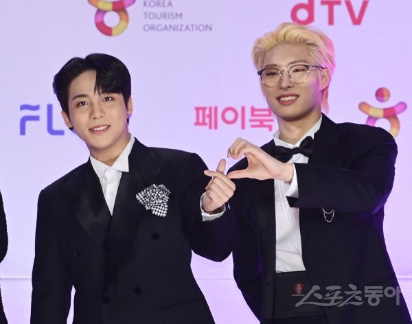 에이티즈 종호, 민기가 24일 서울 고척스카이돔에서 열린 ‘2022 SBS 가요대전’ 레드카펫 포토월에서 포즈를 취하고 있다.