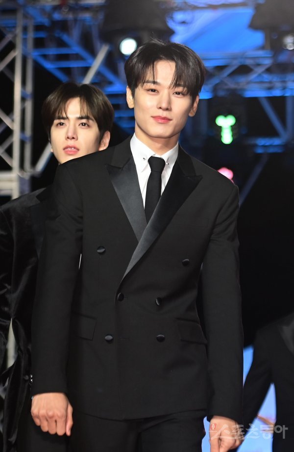 더보이즈 주연이 24일 서울 고척스카이돔에서 열린 ‘2022 SBS 가요대전’ 레드카펫에서 취재진에게 인사하고 있다.