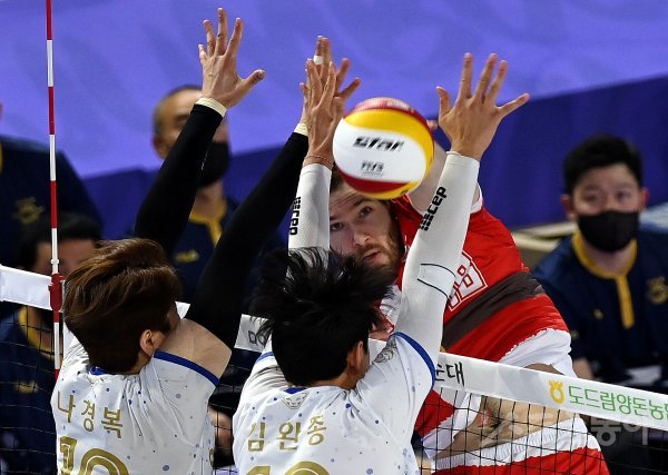 25일 인천 계양체육관에서 ‘2022-2023 도드람 V리그’ 인천 대한항공과 서울 우리카드의 남자부 경기가 열렸다. 대한항공 링컨이 우리카드 블로커를 피해 스파이크를 날리고 있다.