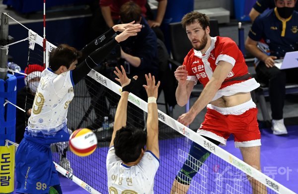 25일 인천 계양체육관에서 ‘2022-2023 도드람 V리그’ 인천 대한항공과 서울 우리카드의 남자부 경기가 열렸다. 대한항공 링컨이 우리카드 블로커를 피해 스파이크를 날리고 있다.