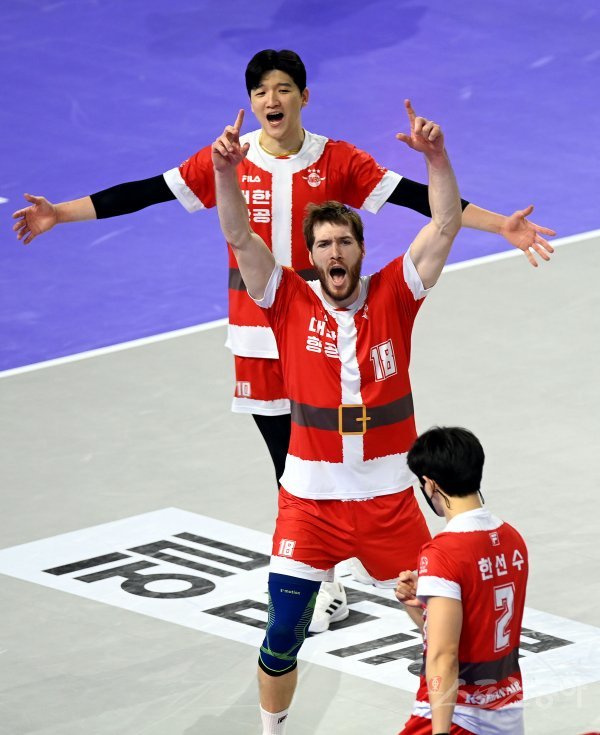 25일 인천 계양체육관에서 ‘2022-2023 도드람 V리그’ 인천 대한항공과 서울 우리카드의 남자부 경기가 열렸다. 대한항공 한선수의 득점에 링컨, 정지석이 기뻐하고 있다.