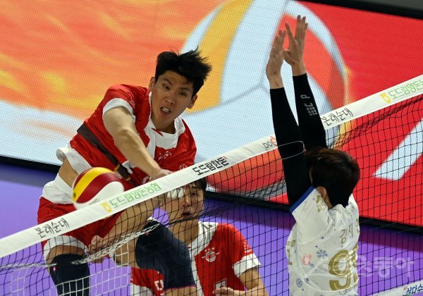 25일 인천 계양체육관에서 ‘2022-2023 도드람 V리그’ 인천 대한항공과 서울 우리카드의 남자부 경기가 열렸다. 대한항공 김규민이 우리카드 블로커를 피해 공격을 펼치고 있다.